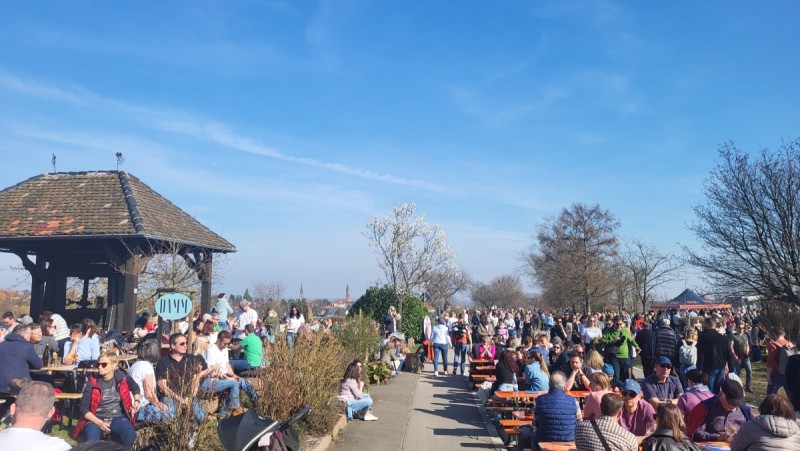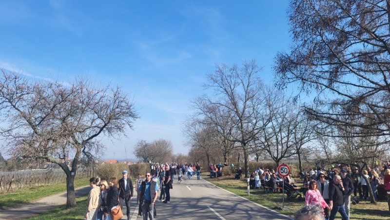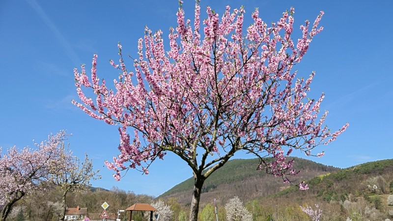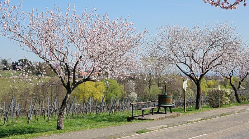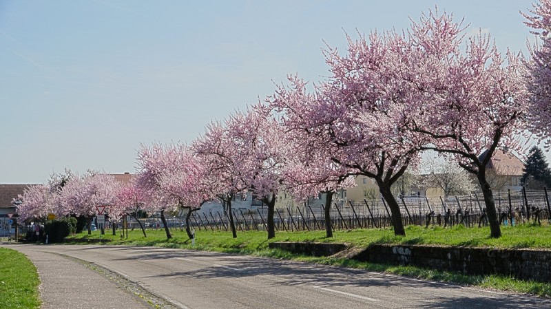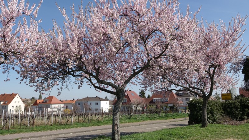 Die rosa Blütenpracht entlang der ca. 2 km langen Mandelbaumallée lädt durch die verschieden farbig blühenden Bäume und dem herrlichen Panoramarundblick (Schloss Villa Ludwigshöhe, dem Hambacher Schloss, dem Friedensdenkmal u.v.m.) zum Flanieren ein.